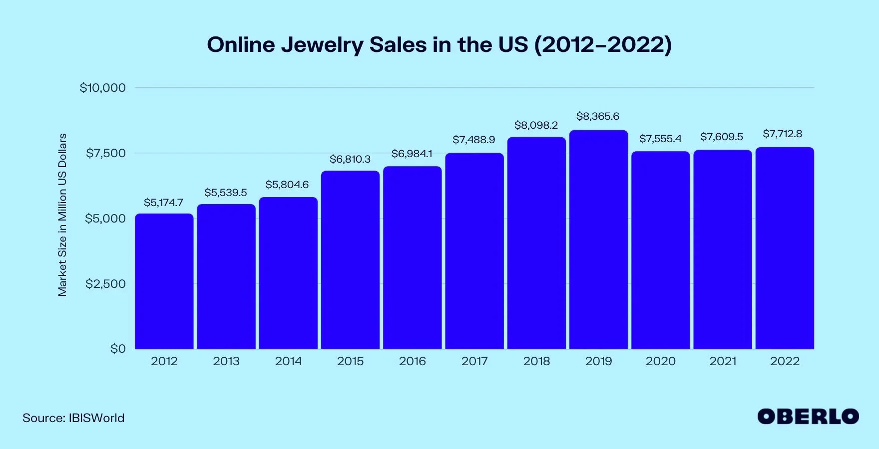 Jewelry ecommerce is growing as a portion of overall jewelry retail sales. This data from the article Online Jewelry Sales Statistics (2011–2022) summarizes ecommerce revenues in jewelry retail.